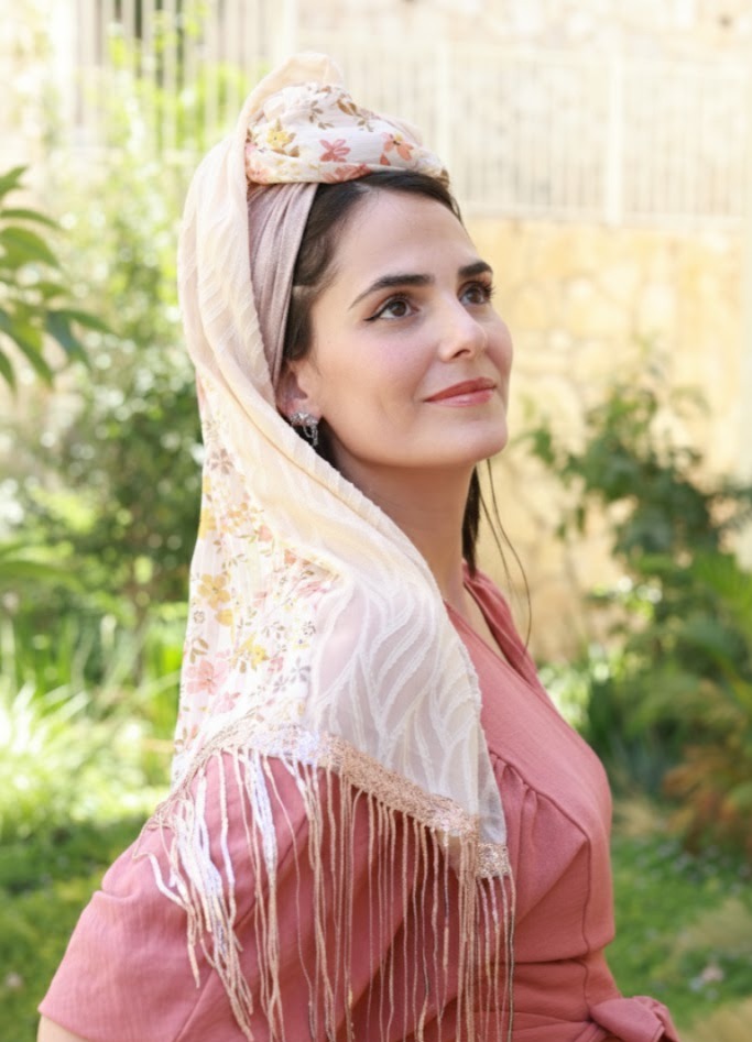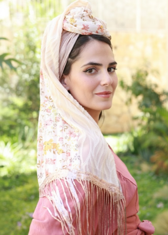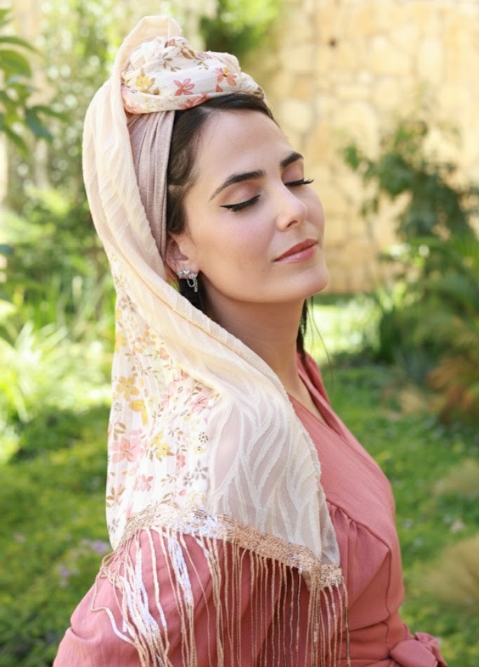 רוז היא מטפחת פרחונית בגוונים בז׳יים עם שילוב לורקס מנצנץ ופרנזים בצבע זהב ורוד (Rose Gold), ליצירת מראה אלגנטי ומעודן. מתאימה לאירועים מיוחדים וליום-יום.